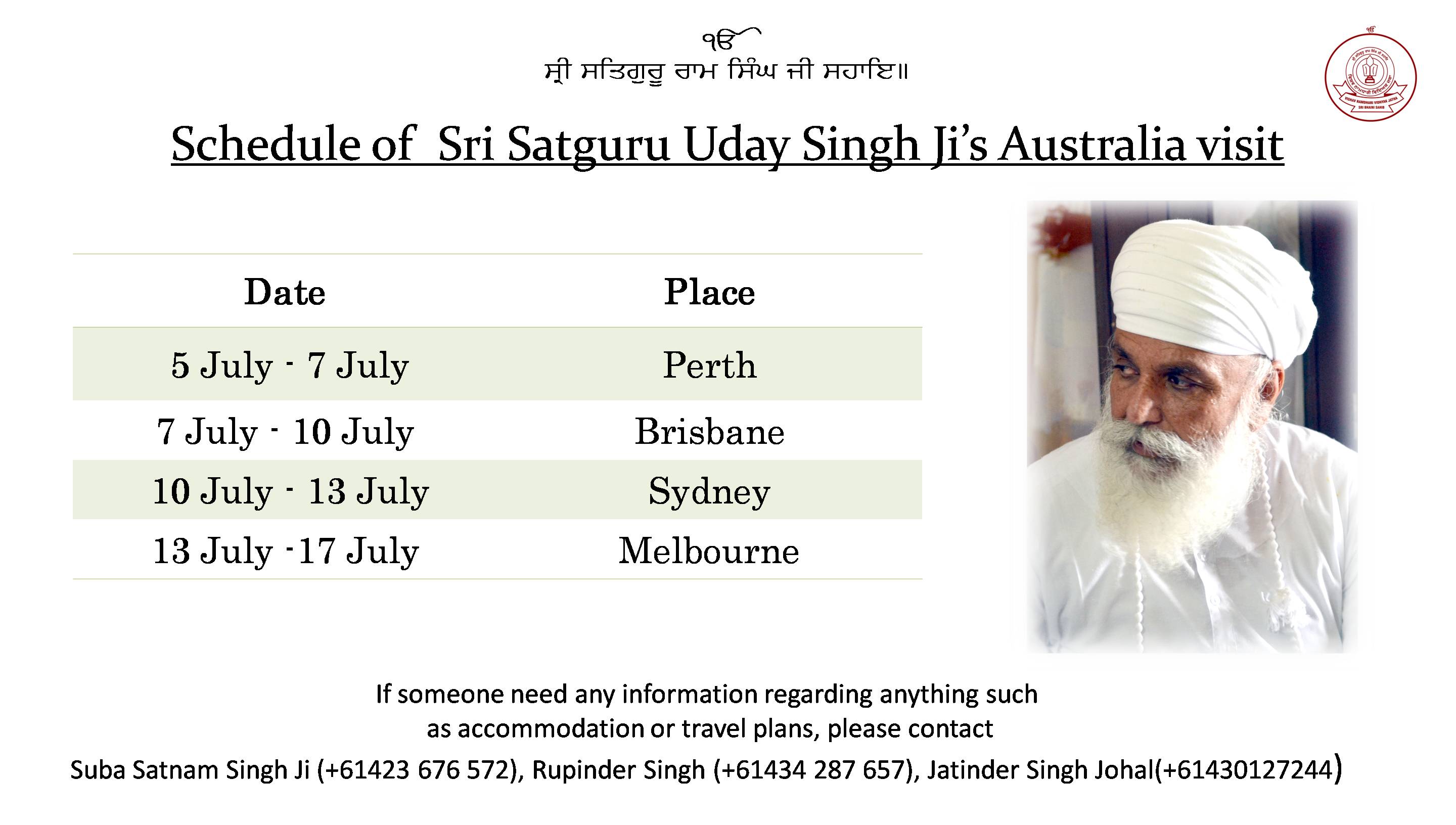 Schedule of Sri Satguru Ji's Australia tour