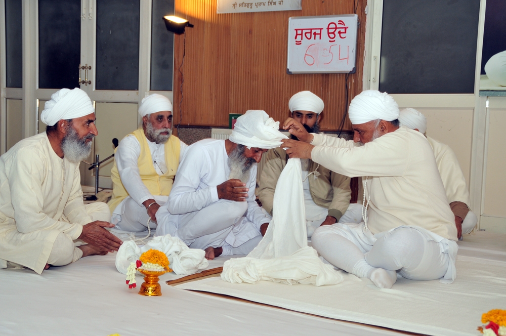 Sri Satguru Ji tying turban during bhog ceremony of Sant Pyara Singh Ji on 2 March 2015